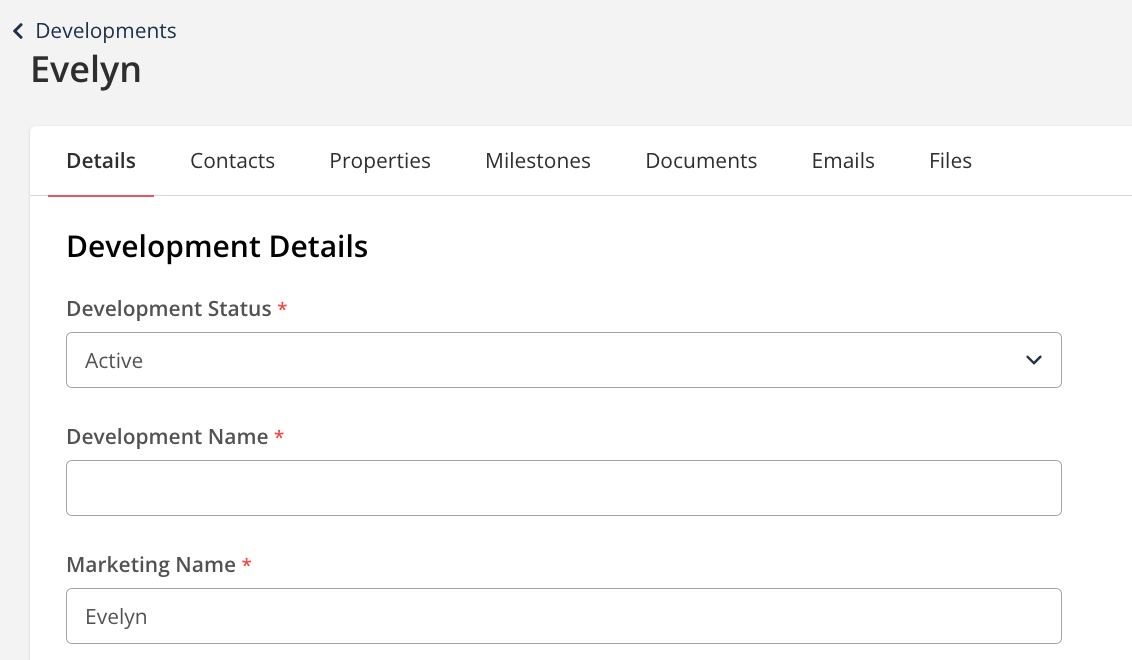 The profile page of a development allows users to manage property details and create overrides for existing templates.
