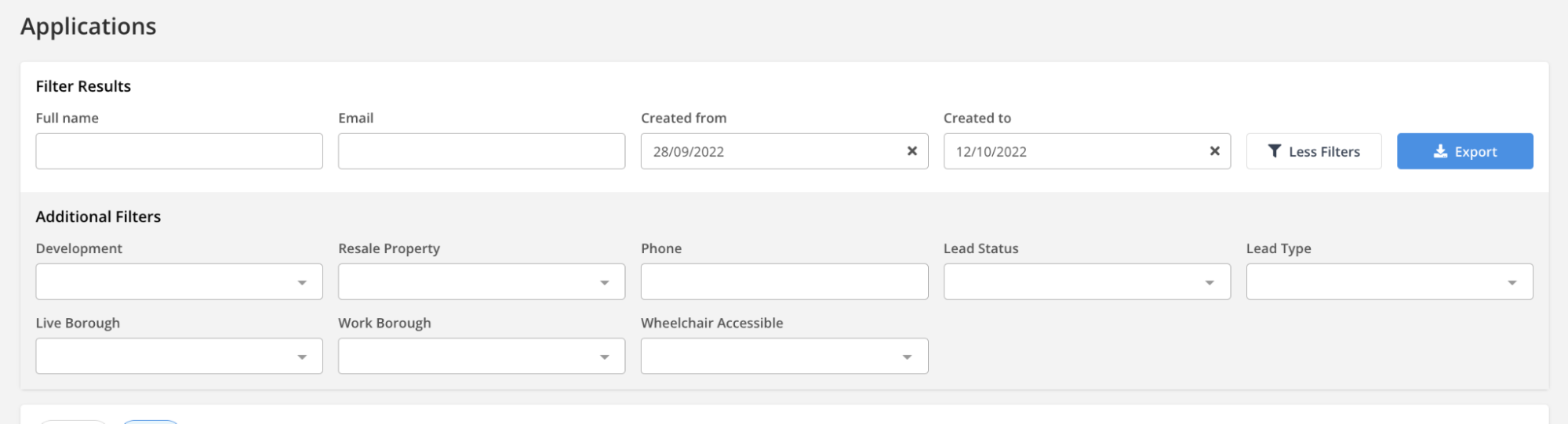 A basic overview of recent applications is displayed here. Additionally, users can use the button to download a spreadsheet of their current view.