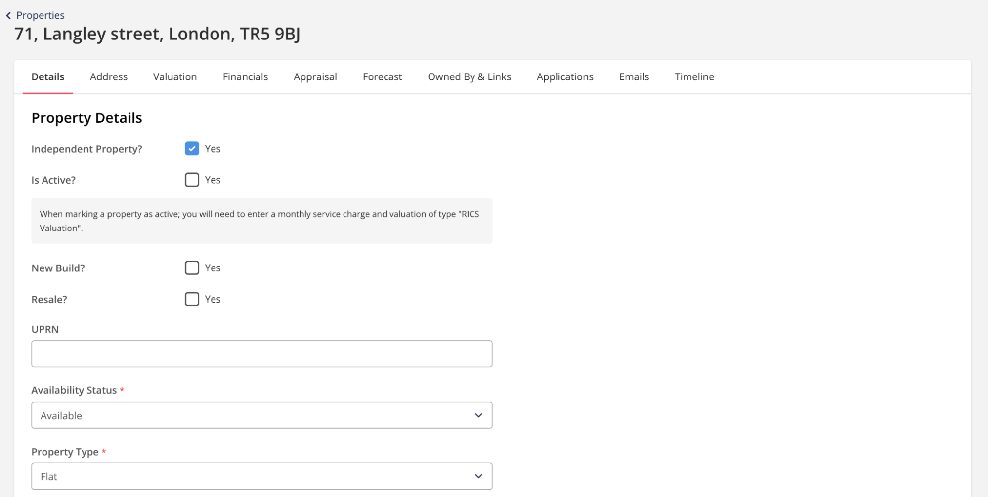 - Confirm to open the ‘New Property’ form relating to the sales types as there hasn’t been one created as of yet.